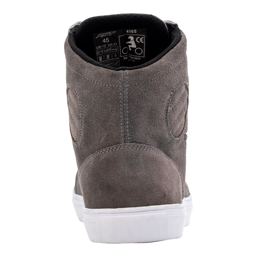 These high top motorcycle trainers are an excellent alternative to the traditional motorcycle boots, and help to complete the casual urban look when paired with an RST Kevlar Hoodie and RST Kevlar Jeans. The grey suede outer construction is chic but hardwearing, offering protection against abrasion in the event of a slide across tarmac. The suede outer material is incredibly lightweight and comfortable for many miles of comfortable riding and feature perforated panel ventilation openings, allowing cool air to flow directly into the boot when riding, leaving your feet feeling fresh and dry when you reach your destination, even on the warmest of days.