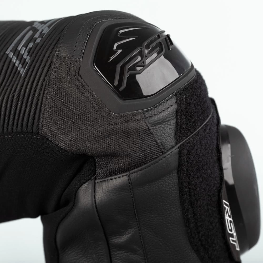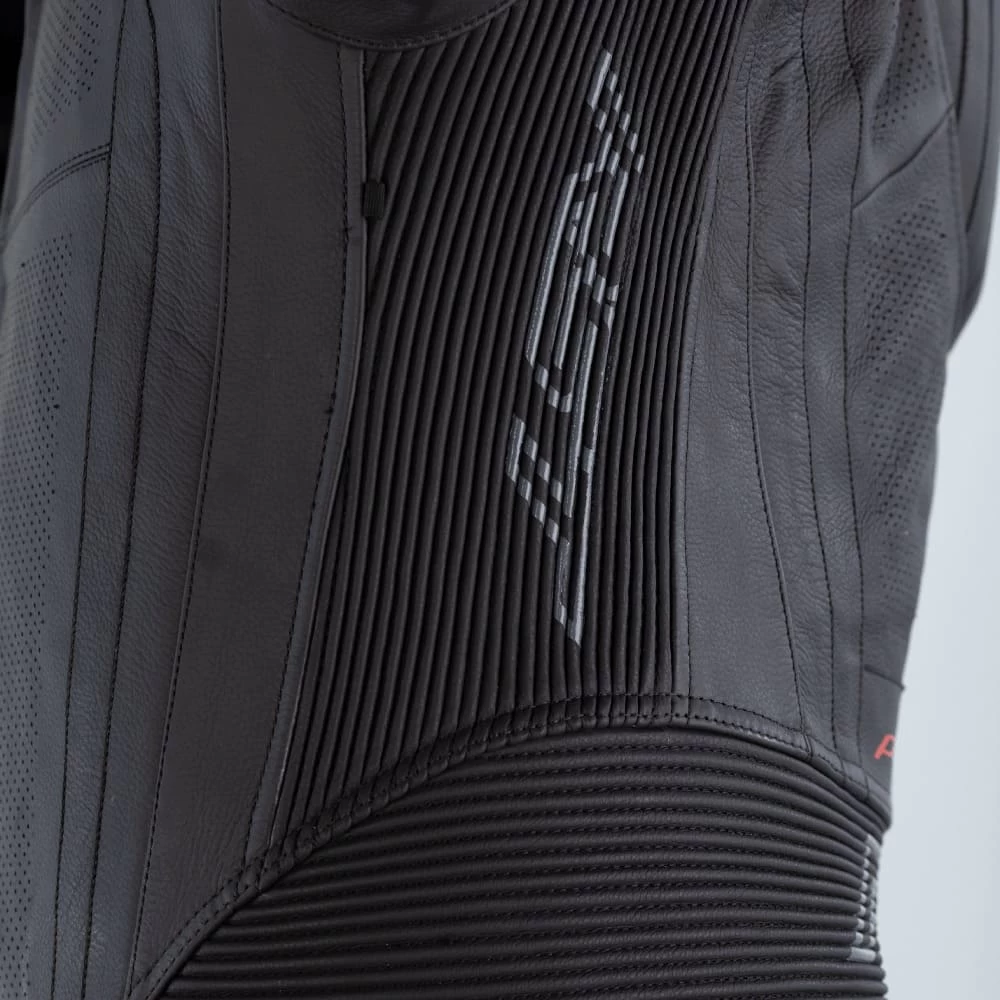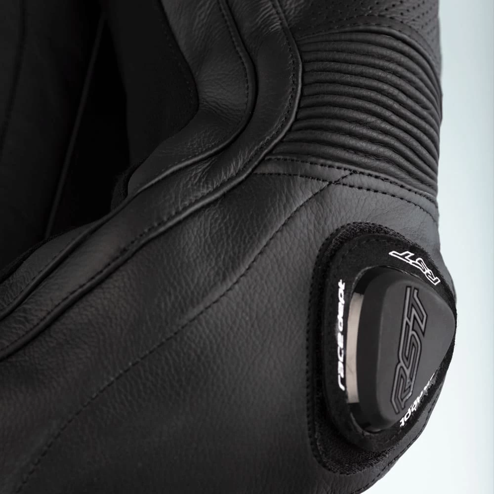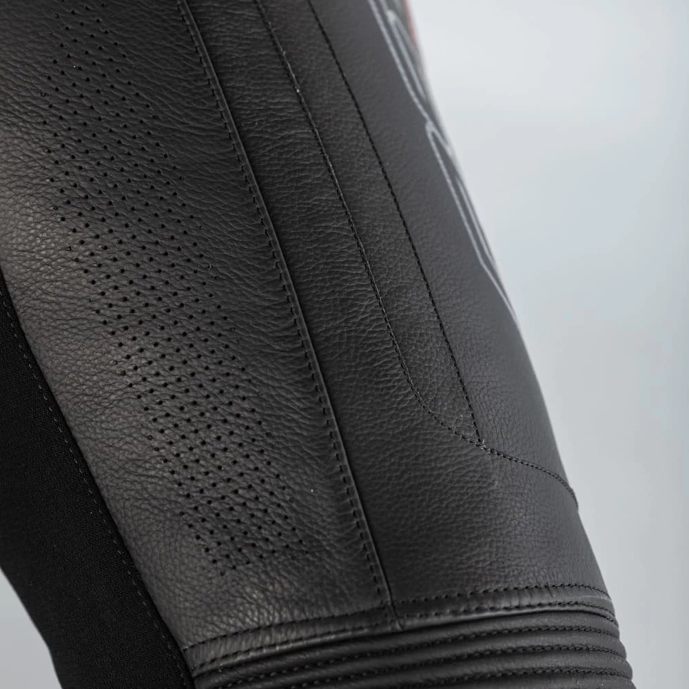 In addition to the inclusion of the airbag system, you’ll also find a full suite of CE approved armour; CE Level 2 Armour can be found at the shoulders, elbows and hips, with the inclusion of CE Level 1 knee armour and the CE Level 1 back protector which houses the In&Box for the airbag protection system. Look to the shoulders and knees and you’ll notice the RST TPU Cups fitted in these areas, offering impact protection from the exterior of the suit and helping the suit to slide rather than grip at these areas. They’re also particularly stylish and contribute nicely to the instantly recognisable RST leather suit look. Beneath the TPU knee cups you’ll find RST knee sliders, which help to complete the factory racing fit and feel of the suit. These sliders are quick release thanks to an easy to use ring pull style system, letting you remove your knee sliders and replace them quickly and get back on track. Elbow sliders are present too, with a simple Velcro attachment, if you’re brave enough to get your elbow down too! Finally, a rubberised Kevlar material at the inside of the knees offers a supreme level of resilience while providing great grip on the side of the tank, perfect for hanging off the bike when cornering and under hard braking.