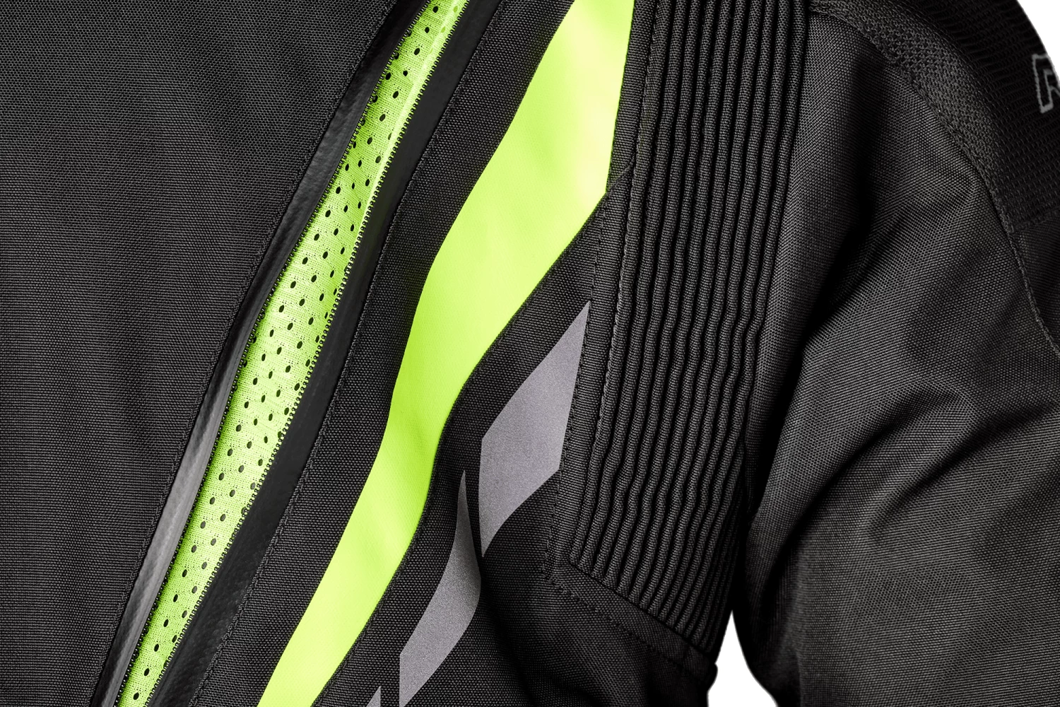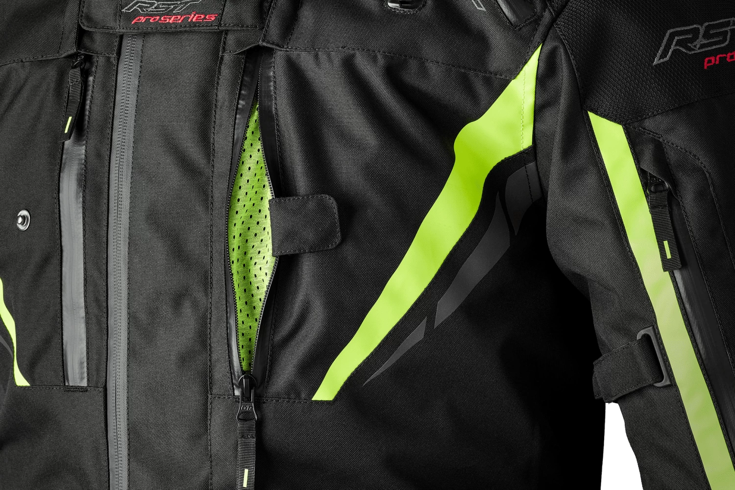 Comfort is king in many motorcycle jackets, touring textiles or otherwise. One of the considerations for the RST Paragon 7 textile jacket was an improvement to the fit of the jacket, and RST have delivered! RST include accordion motion stretch panelling at the back of the elbow as well as the upper shoulders at the rear of the jacket, ensuring that you are not restricted by the material makeup of the jacket, whether on the bike or off it. A neoprene comfort collar also helps reduce irritation at this area when traveling over longer distances, a welcomed feature for the touring biker. At the collar you’ll also find a throat coat with a revised shape, designed to keep wind-chill and precipitation entering the jacket, aiding further in keeping you warm and dry when out on your bike. This throat coat is removable thanks to an easy zipper system, giving you greater freedom in the winter. In addition to this, a hook at the collar allows the collar to be pulled to one side, allowing greater wind entry into the jacket in the summer!