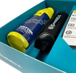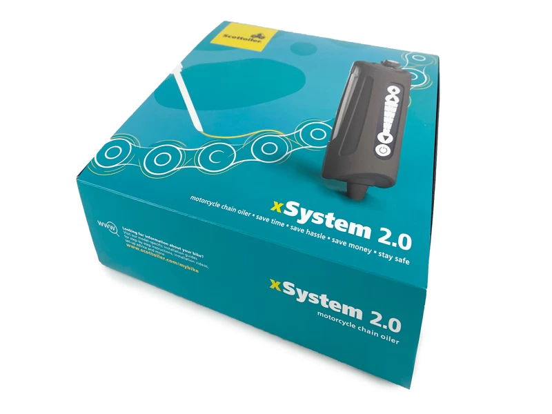 The Scottoiler X System 2.0 kit contains the new X system, a 250ml bottle of Scottoil, tubing, clips, and the installation and operating guide.