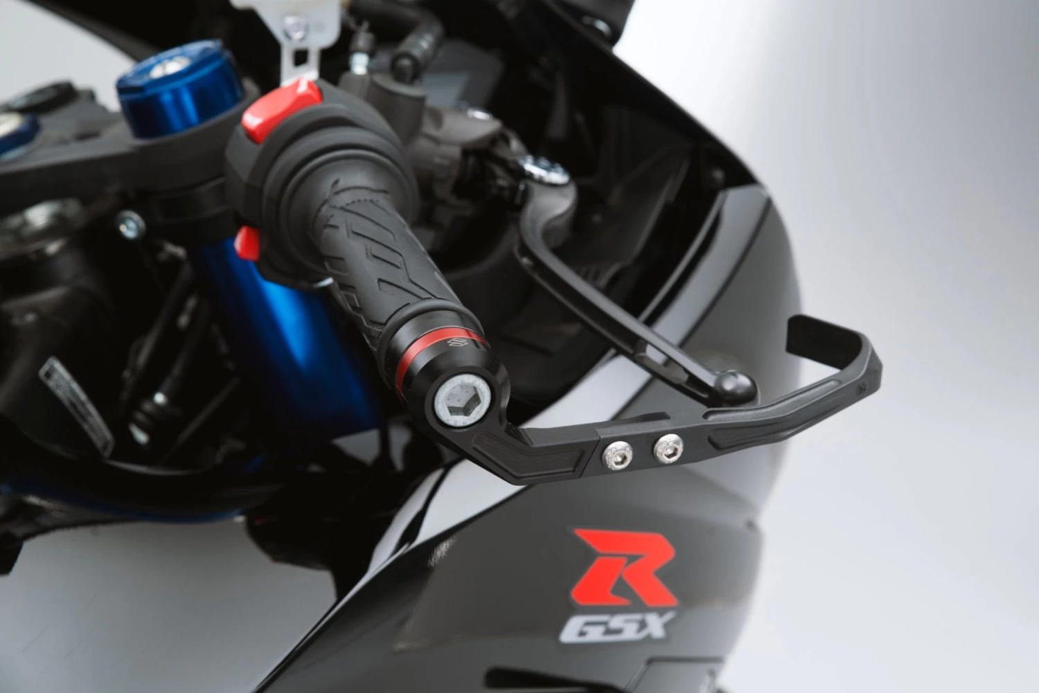 Boost your GSX-R1000 / R sport bike’s racing credentials with genuine accessories from Suzuki. Required by many race classes internationally, brake lever protectors increase your safety on track by making sure the brake lever isn’t accidentally applied when it is knocked by another rider or machine. It also adds an additional guard to shield your hands from impact. Red spacers included.