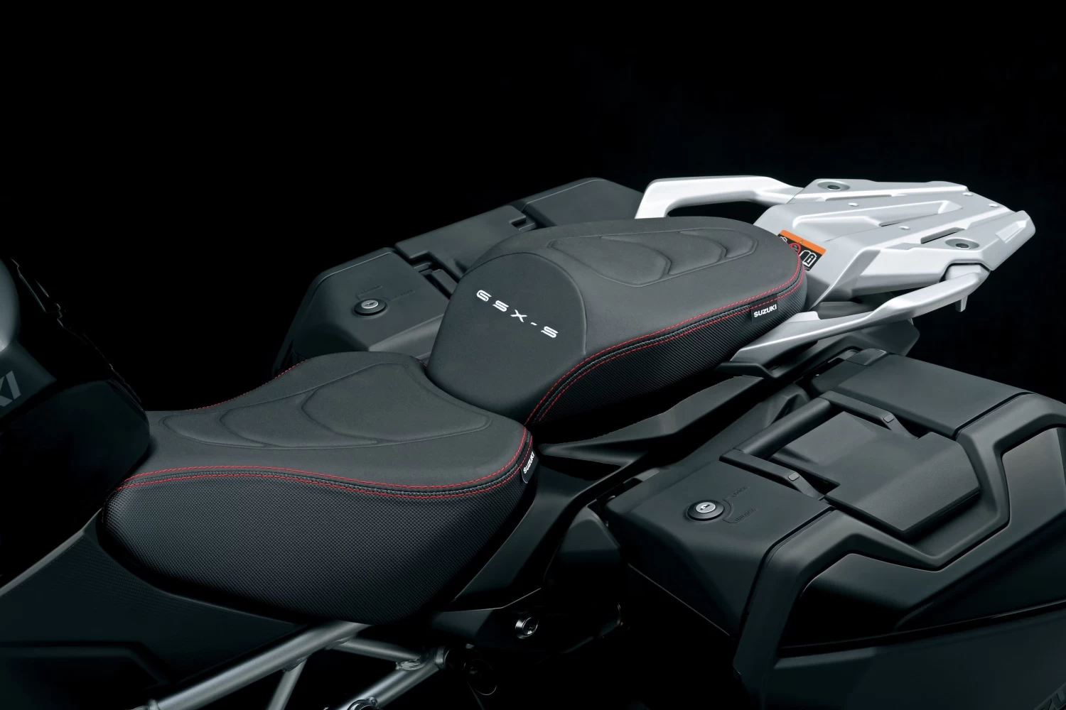 The top surface material features a matte “pear grain” finish, chosen for its resemblance to suede, its luxurious texture and the positive grip it provides the rider. The side skin uses a coarse-weave material that has a light, functional look similar to that of sports and outdoor gear. An embroidered GSX-S logo adds a crowning touch to this seat’s premium finish.